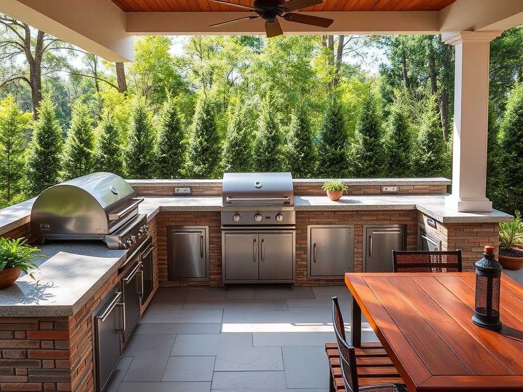 Custom-built outdoor kitchen areas equipped with grills, countertops, sinks, and storage for a complete outdoor cooking experience.